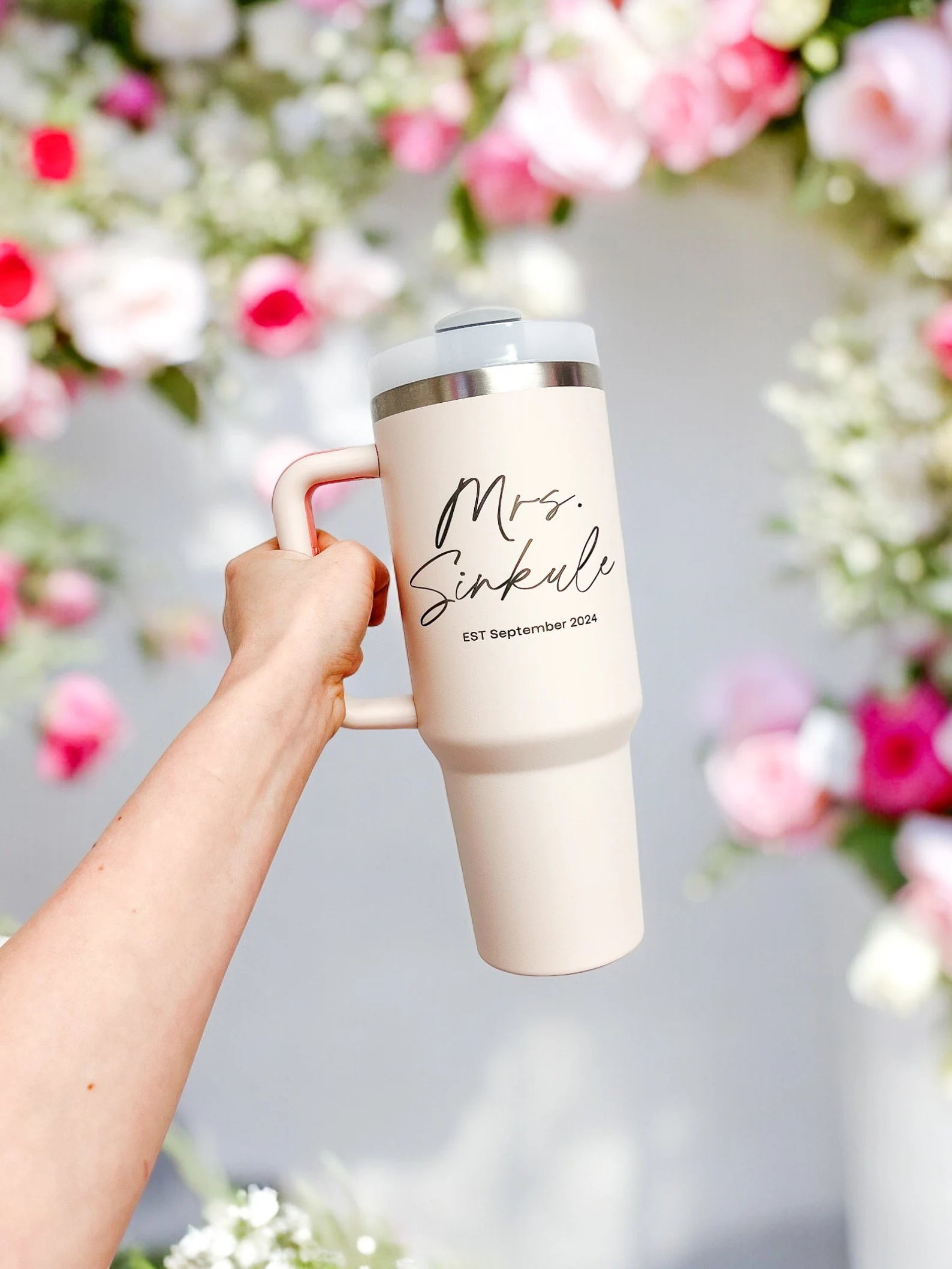 This personalized 40 oz tumbler features an etched laser engraved design and a sturdy handle, making it easy to carry and perfect for any outdoor adventure. The tumbler is made from high-quality stainless steel, ensuring it is durable and will last for years to come. This makes the PERFEECT gift