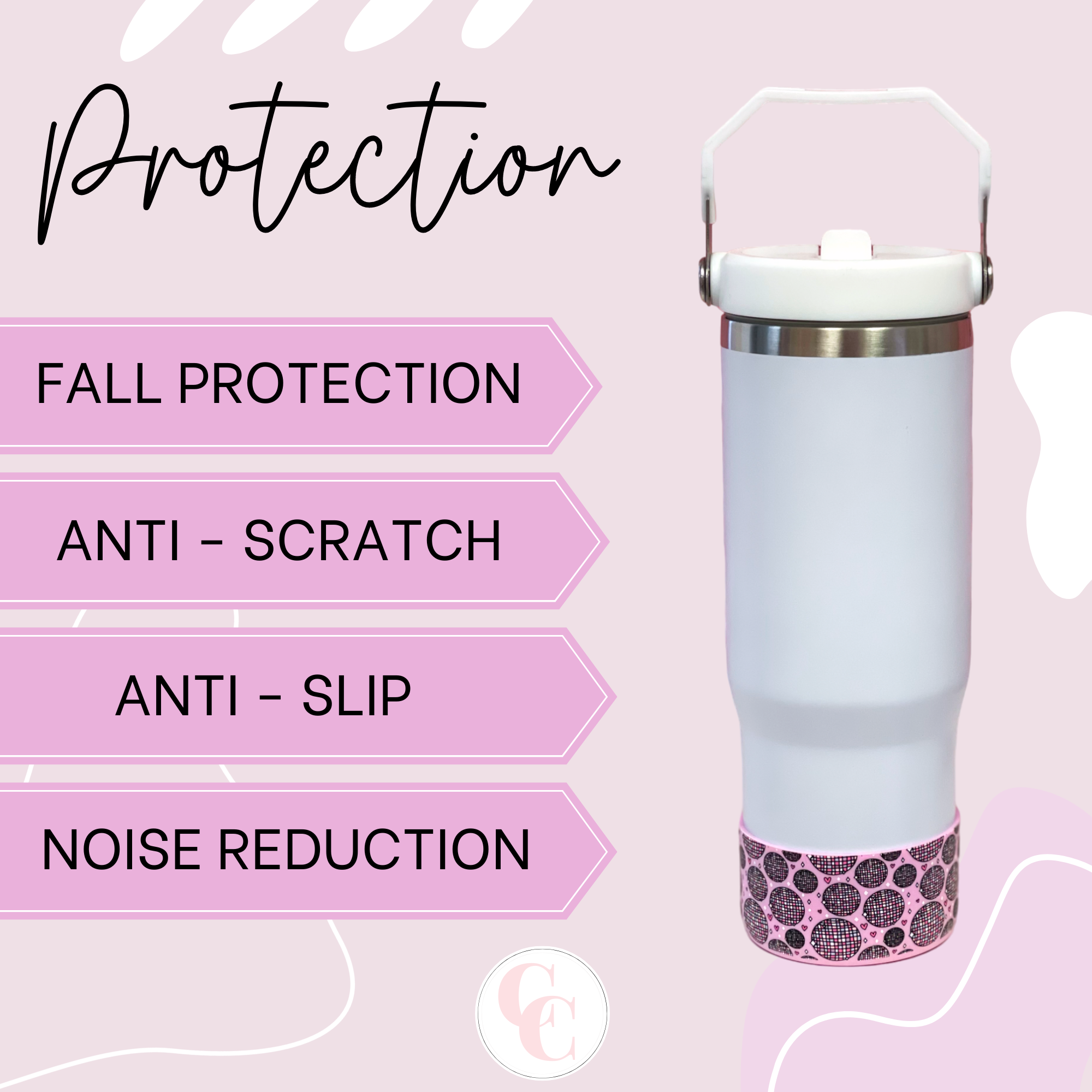 The silicone sleeve features a textured and ribbed surface that provides a secure and comfortable grip. This anti-slip design helps prevent accidental drops and spills, ensuring that your bottle or tumbler remains in your hand or on surfaces. It helps safeguard against scratches, dings, and minor impacts.