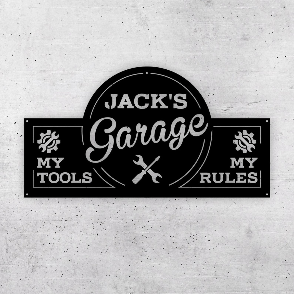 A beautiful custom sign that you can use to decorate your garage or workshop. Personalize it with a name, which makes it perfect for a birthday, christmas, father's day, valentines day, or even housewarming gift.