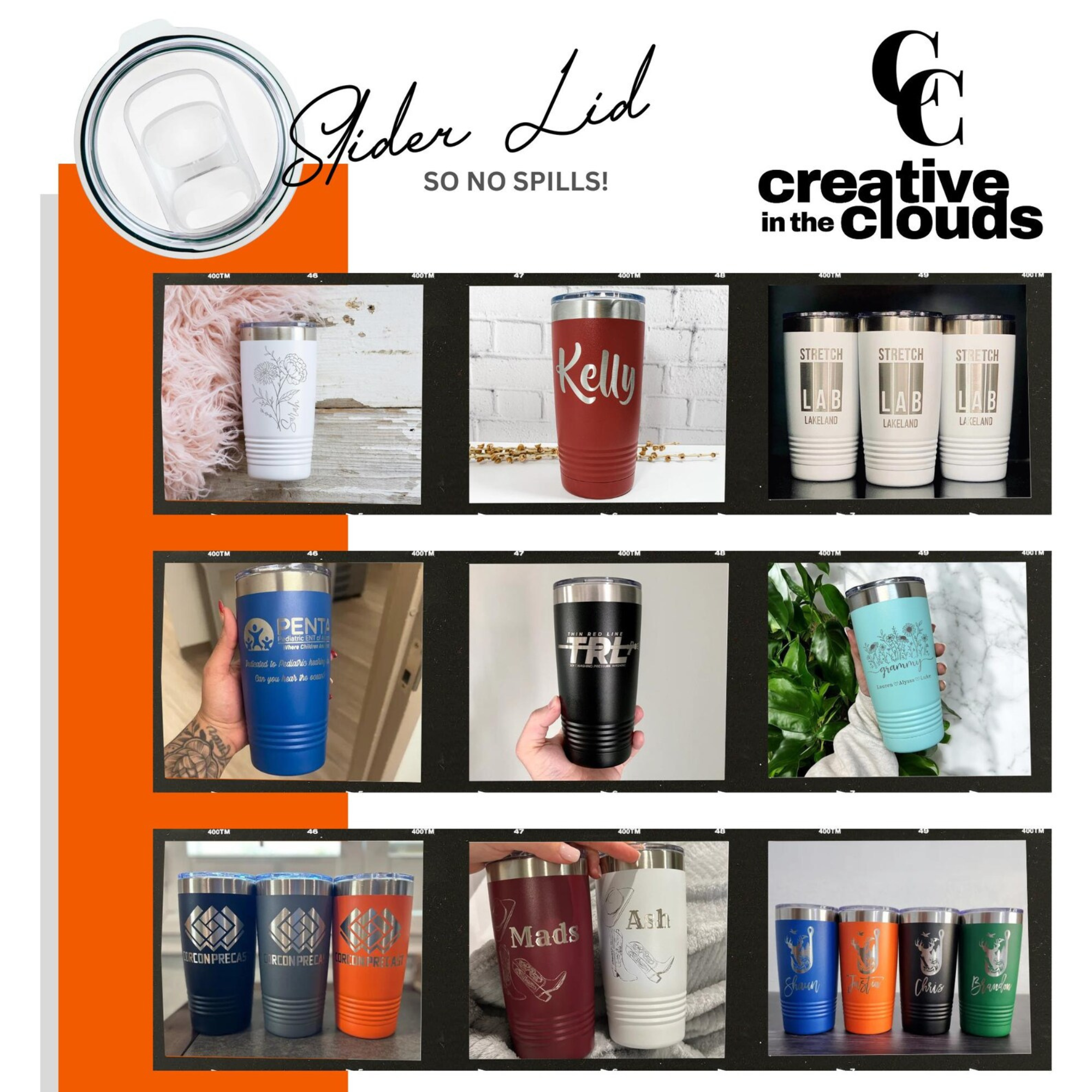 Designed for on-the-go convenience, our 20 OZ Stainless Steel Tumblers double-wall vacuum insulation ensures your beverages stay at the ideal temperature for hours. Enjoy your favorite hot coffee or refreshing iced tea without worrying about temperature changes. Not only is this tumbler practical, but it's also eco-friendly and reusable, helping reduce single-use plastic waste. Plus, it's BPA-free, ensuring your drinks stay free from harmful chemicals. Slider Lid for easy closing of the Lid. Customize your tumbler with personalized laser engraving, adding your name, or a special message, that reflects your personality - Designs that won't fade or peel over time. No Straw Included.