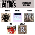 Our metal signs are powder coated with your choice of color - black, white, silver, red, or copper. They are laser cut with 16 gauge cold rolled steel, rust proof and made for outdoor OR indoor use. This is a lighter metal to reduce weight for hanging purposes!