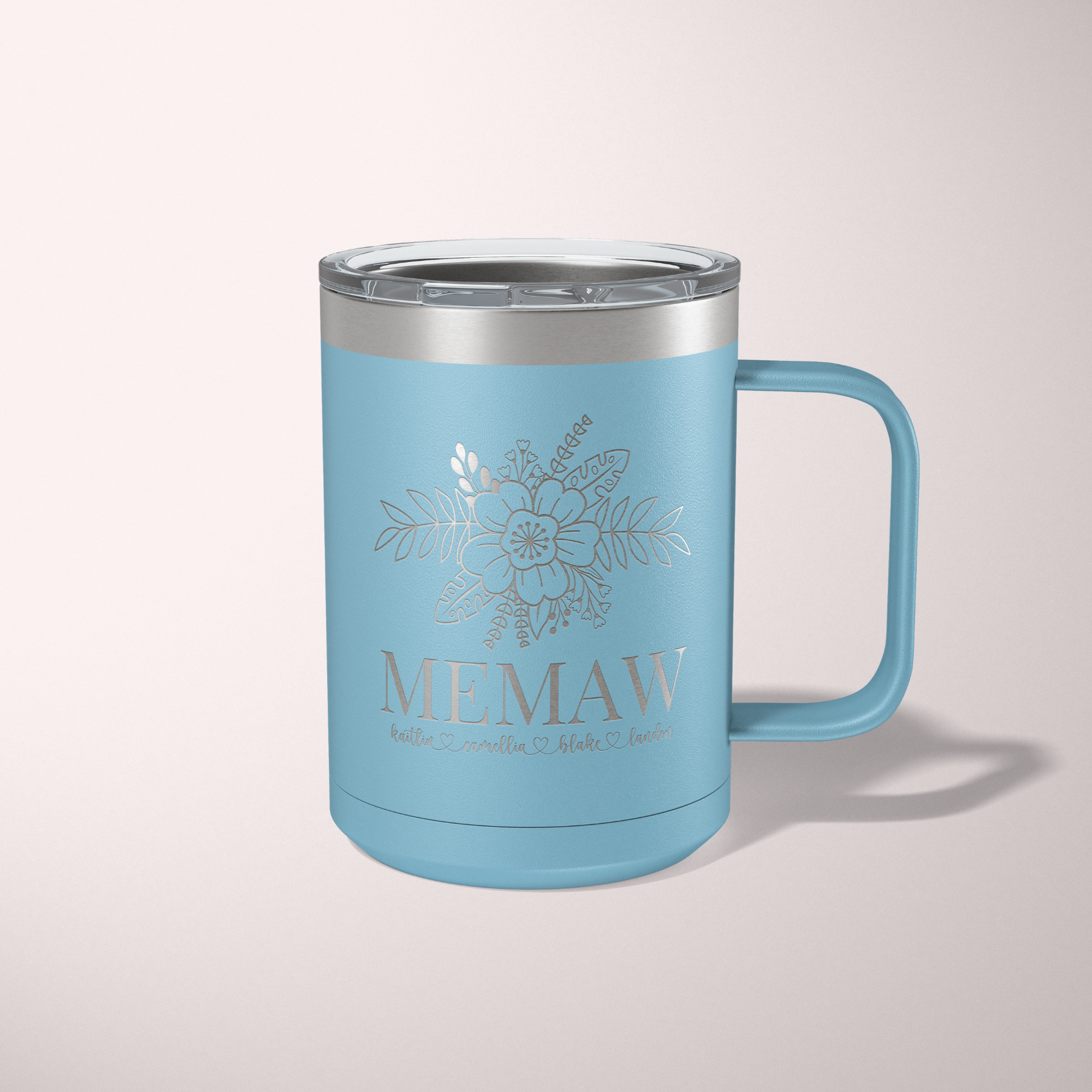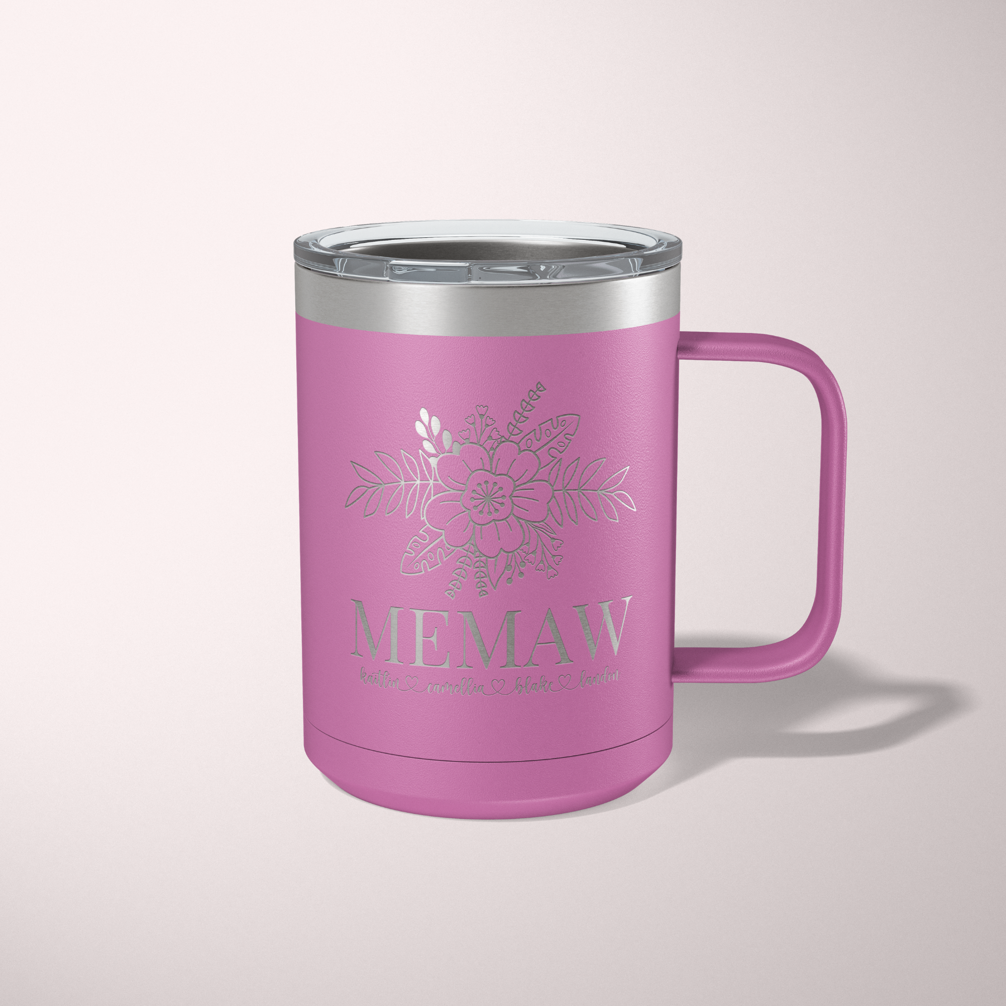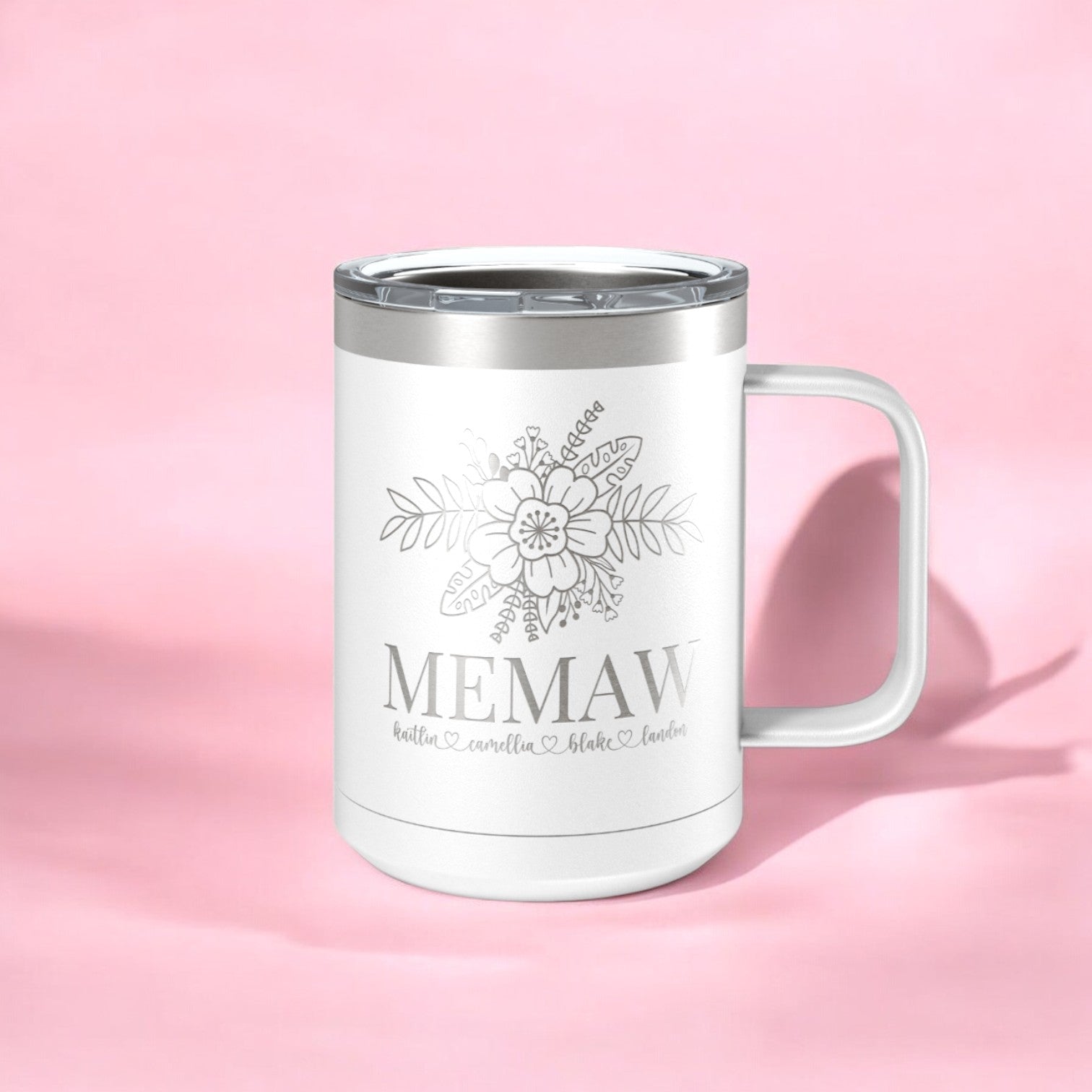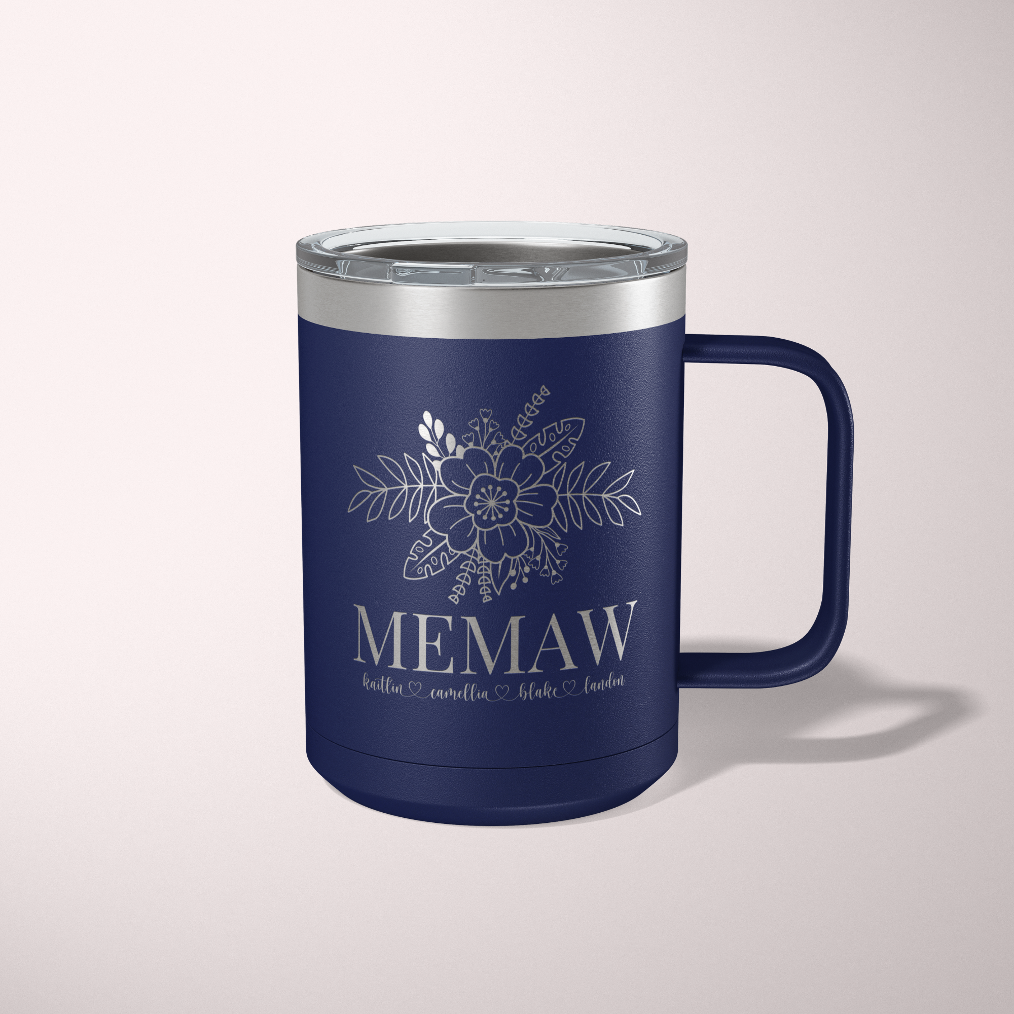 Personalized Floral Grandma Travel Coffee Camp Mug with Grandkids Names
