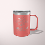 This personalized 15 oz travel coffee mug tumbler features an etched laser engraved design and a sturdy handle, making it easy to carry and perfect for any outdoor adventure. The coffee cup is made from high-quality stainless steel, ensuring it is durable and will last for years to come. This makes the PERFEECT gift for anyone!